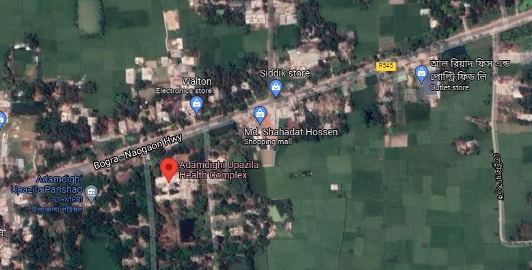 কেন্দ্রিয় বাসটার্মিনাল বগুড়া থেকে সড়ক পথে নওগা মেইল বাস যোগে আদমদীঘি বাসস্ট্যান্ড থেকে পূর্বে ২০০ গজ দুরে আদমদীঘি স্বাস্থ্য কমপ্লেক্স ভবনের দক্ষিনে অবস্থিত।